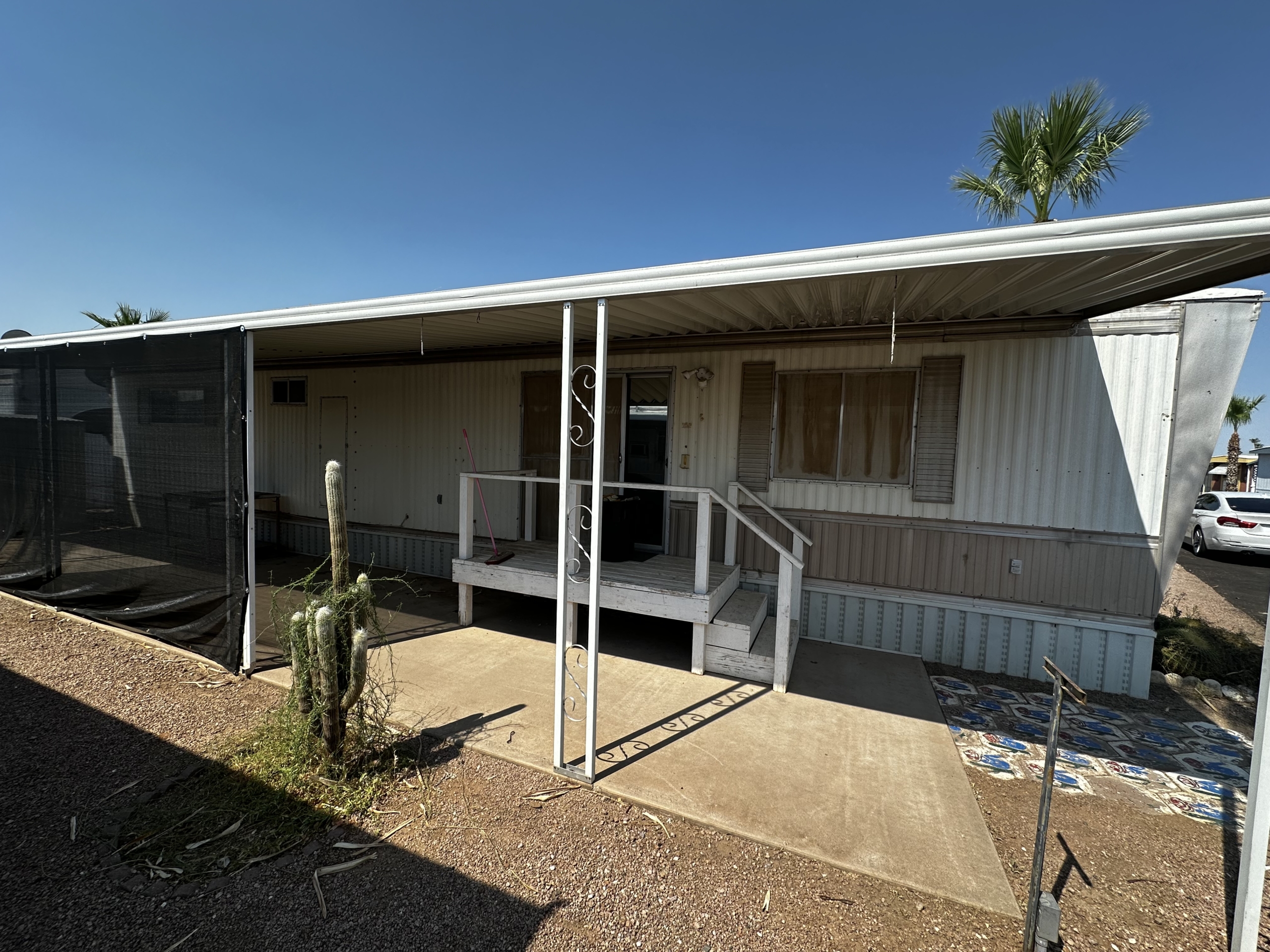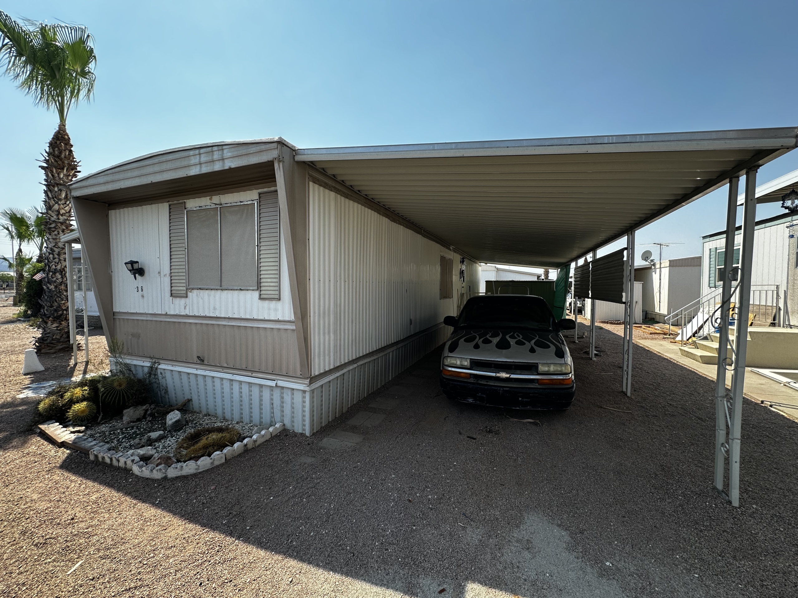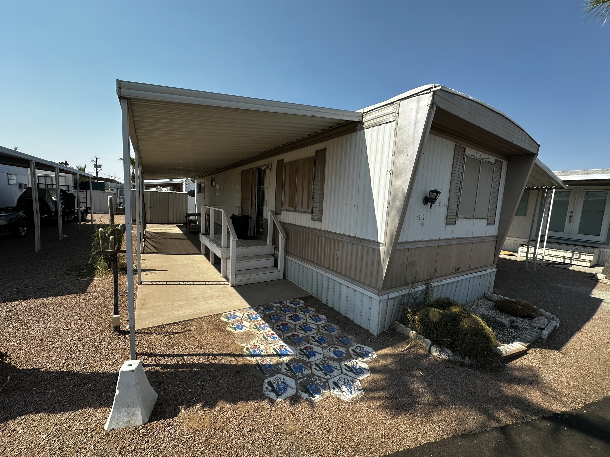 Charming 1 bed, 1 bath mobile home nestled at 1030 N Delaware, Lot 36, Apache Junction, AZ 85220. Located in a quiet and friendly over 55 community at Minari Mobile Home Court. This home offers ideal full-time living or a perfect retreat for winter visitors. Enjoy the convenience of a spacious shady patio, a Large Workshop/Storage Room, and a full-length Car/Vanport providing covered parking for two vehicles.