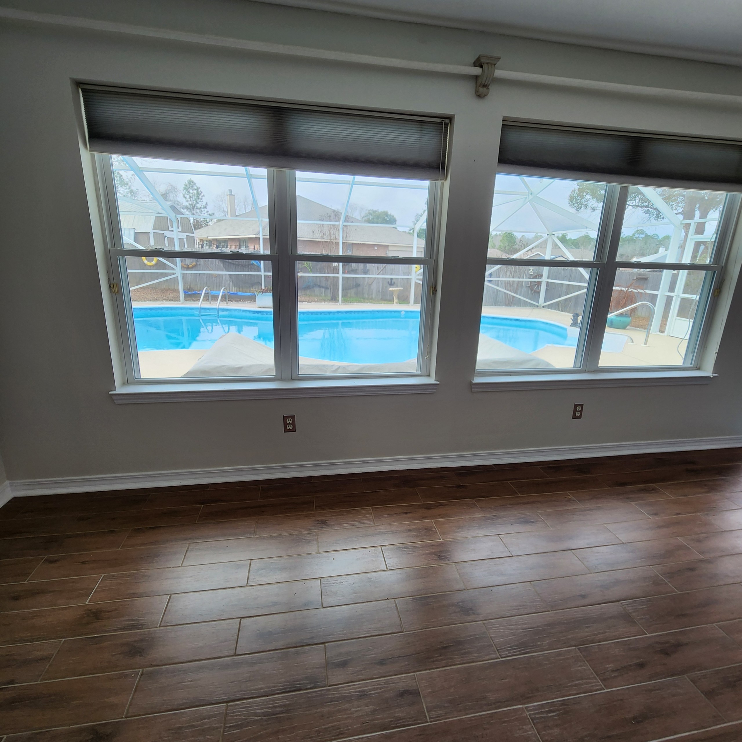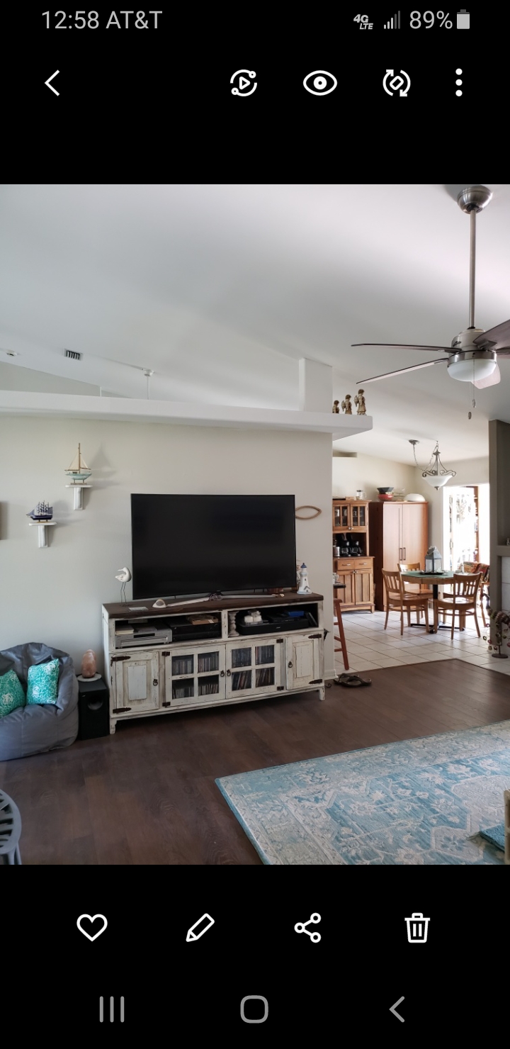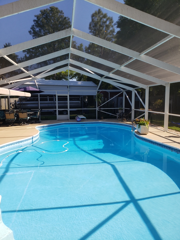 • My wife and I  purchased the home June 2017 after my retirement. Soon after we started a complete upgrade to the house. Painted the brick exterior,  replaced all interior floors  with LVP(luxury  vinyl plank) remodeled all 3 bathrooms,  replaced kitchen counter tops with granite,  removed popcorn ceiling and repainted ceiling.  Installed metal roof,  new pool screen enclosure, installed retractable awning for pool area. Installed 2 aluminum carports to park boats,etc. Installed 6′ privacy fence,  has a work shop, all new energy efficiency windows installed by Window  World. Double sided propane gas log heater and central heating and cooling.  Master bath has a jetted tub and a custom tile shower. The interior of  this home has all new paint and ready to move into