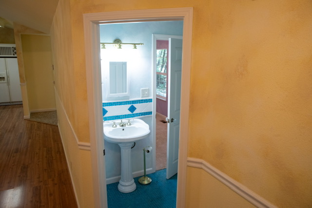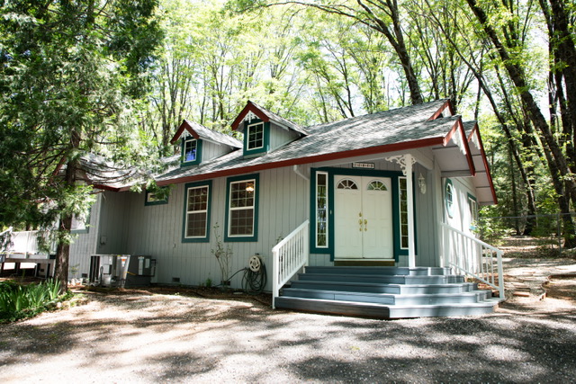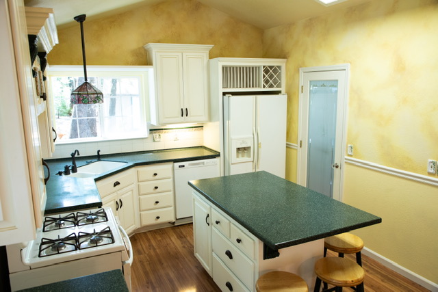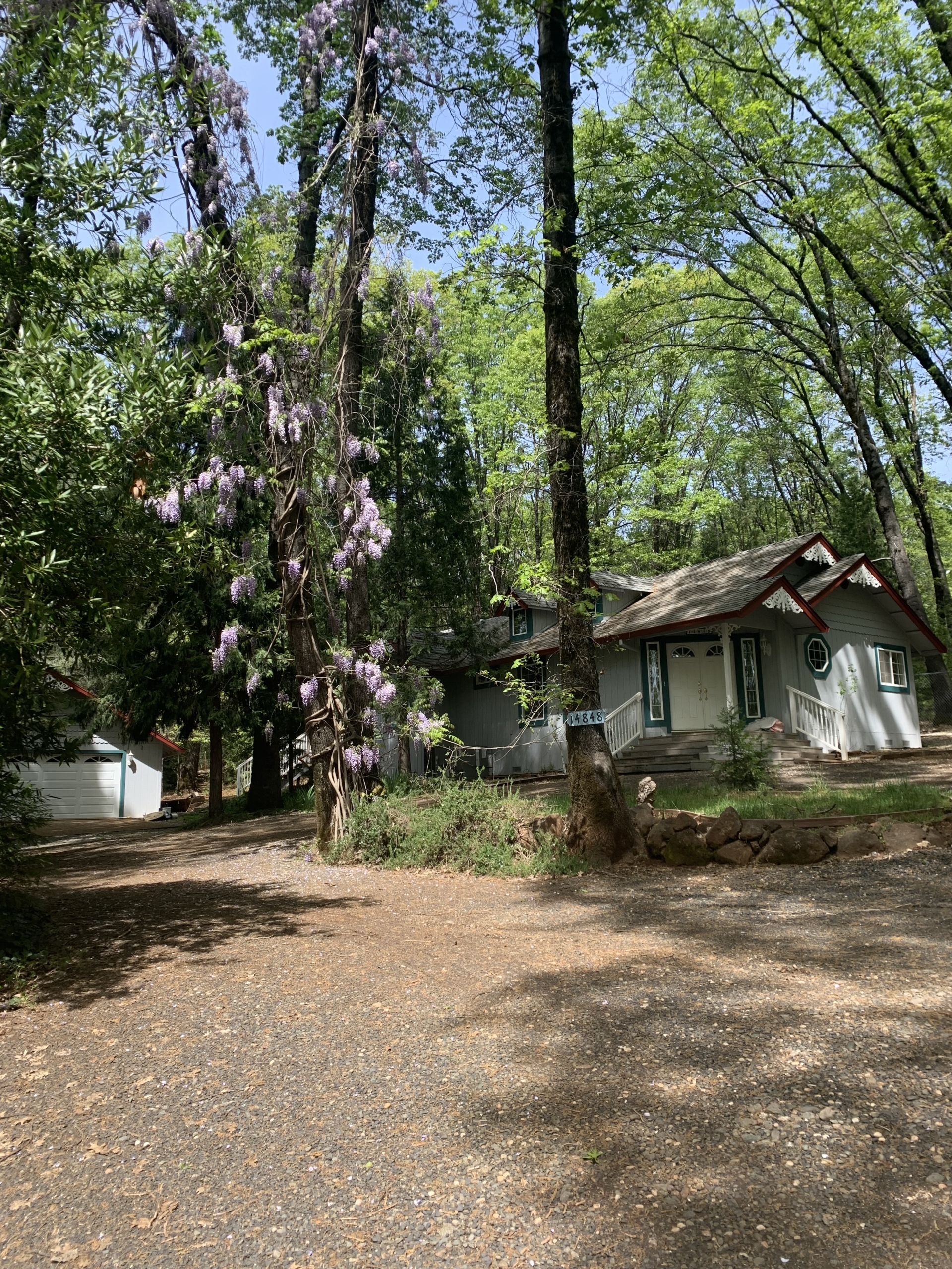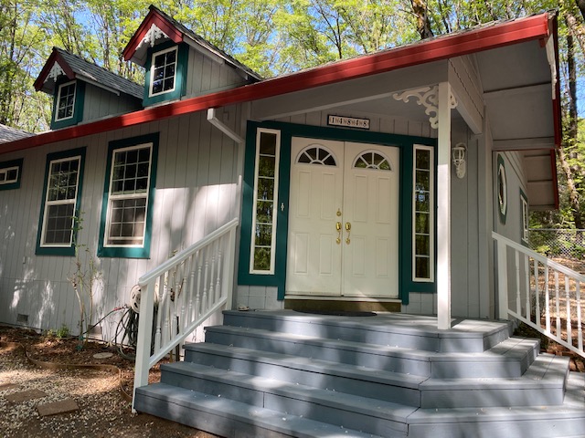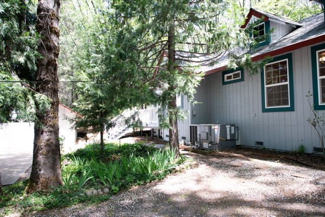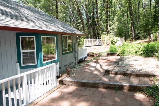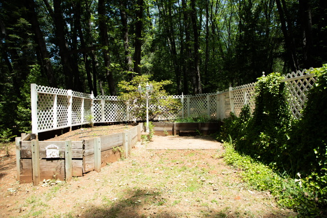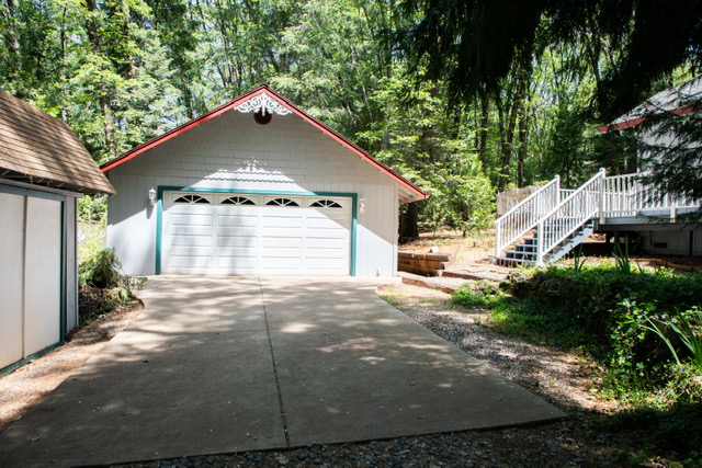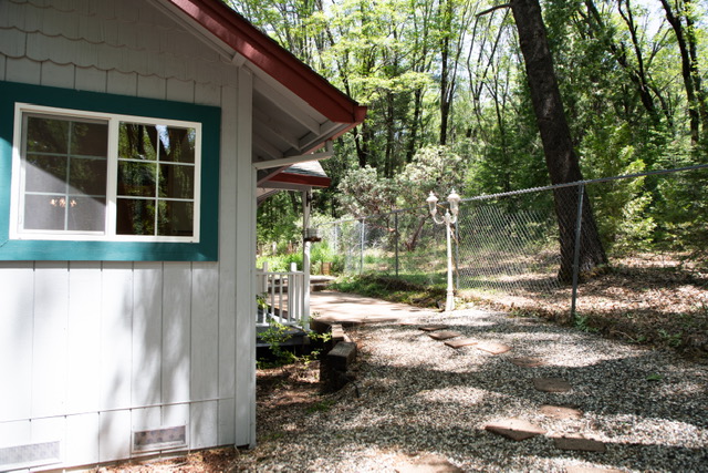 The oversized {12’ x12’} laundry  room features an ocean  mural  painted by Chico artist {he also treated the walls with artful design throughout the home}. Hidden behind louver doors is a space for a washer and dryer and has a utility sink with storage cabinet.  There is also a built~in ironing board along with a ceiling fan/light, and a nice window that provides natural light while you work.  This room is large  enough that it has been utilized as a small bedroom in the past. There is an exterior door that  gives you access  to the deck and leads to the oversized {24’x24’} garage that comes  with an automatic garage door opener, and plenty of  shelves. There is even more storage in the two  sheds on the .49 acre property  that is fenced on three sides for  your privacy and safety. The property also features a beautiful  year round stream &there is nothing like the tranquil sound and sight it offers.