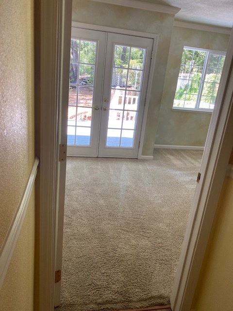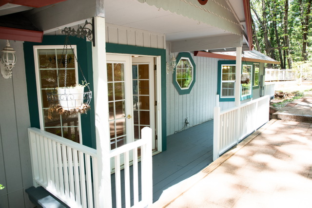Double French doors with retractable screens lead to a patio with a view of the enchanted forest~ a peaceful place to  entertain, grill and dine.