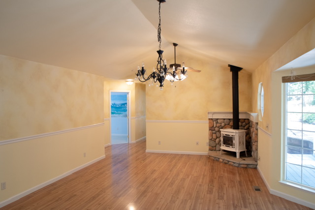 The open cozy living and dining area, invites friends and family to gather around the propane wood stove that is perched on a natural stone hearth with a custom mantle. The dining area features a unique chandelier  with a dimmer switch that allows you to choose your aesthetics to match  your mood .