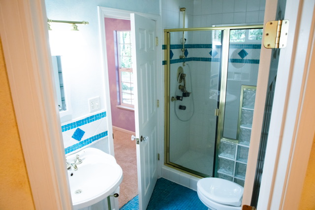 The Jack and Jill guest bathroom features glass tile flooring with complimentary accent tiles above the vintage style pedestal sink and in the shower. The shower enclosure has a glass and brass door and glass blocks with brass fixtures that include lumbar jets that will help you relax after a hard day.