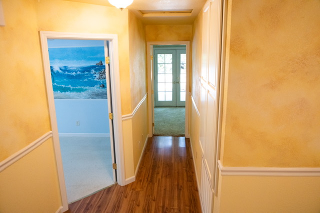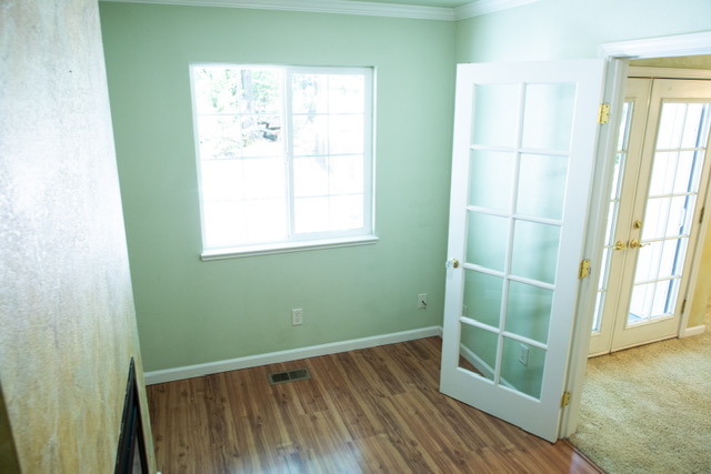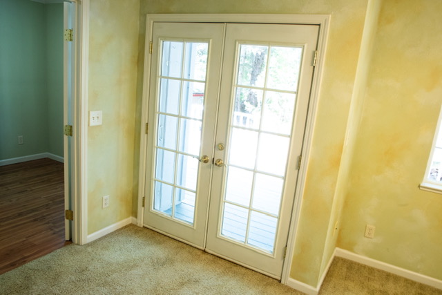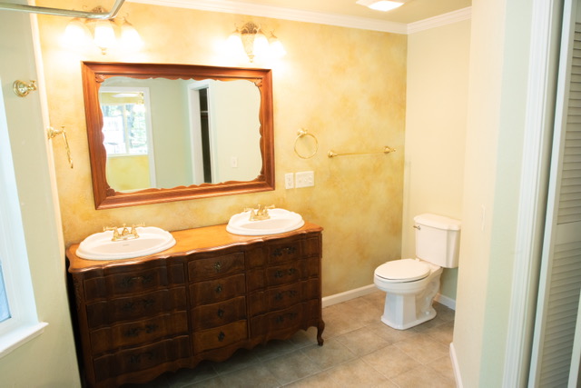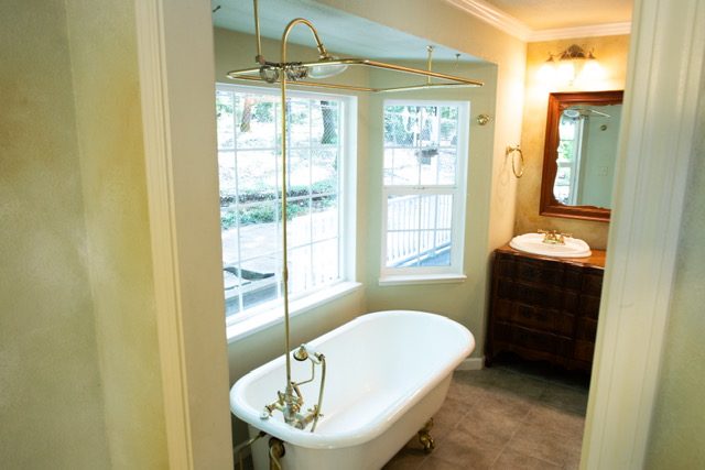 You enter the carpeted master suite through a French door where you will find a ceiling fan/light, two large windows with views of the forest and double  French doors that lead to your private deck where you can relax and enjoy the beautiful peaceful forest setting. A second set of double French  doors give you access to a sitting room/office/den with a propane fireplace and a window that looks out to the forest. The tile master bathroom showcases an 1860’s  vintage clawfoot tub with brass claw feet and matching brass shower fixtures surrounded by bay windows that offered  a tranquil view of the woods as you relax in your bubble bath. There is an antique double sink vanity  to share with  your love with lots of storage and a large matching  antique mirror. The Walk-in  closet  also has plenty of storage shelves to organize your clothes.
