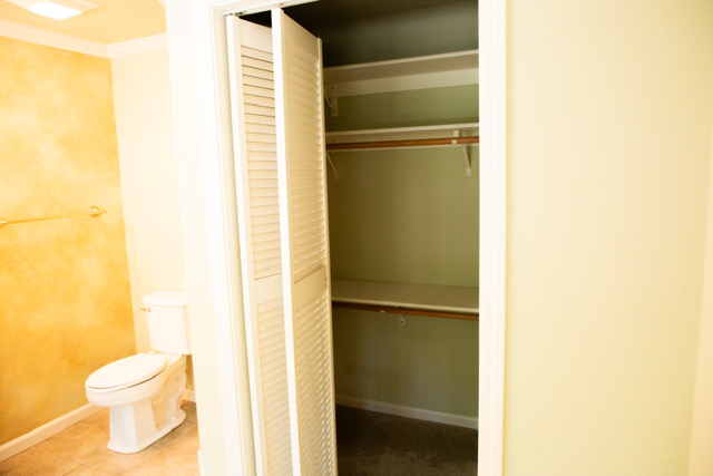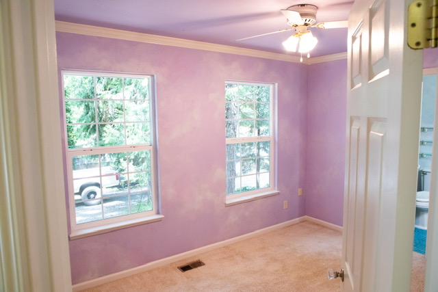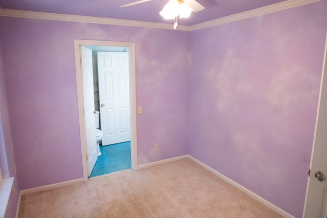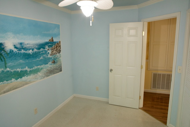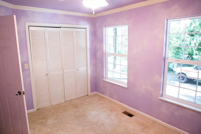 The  guest bedroom attaches  to the guest bathroom and it is carpeted for warmth, has large windows for natural lighting, louver closet doors and a ceiling fan/light.