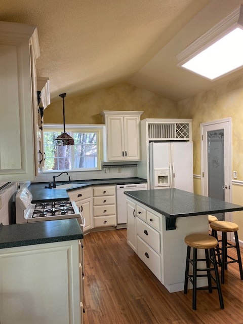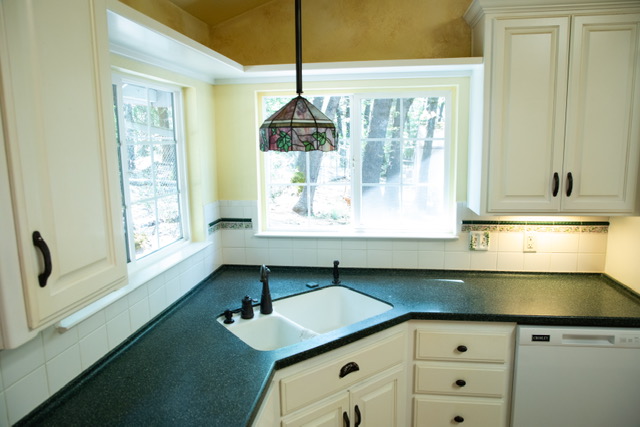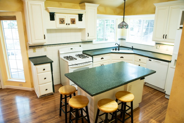 The kitchen has a large Island ~another great area  to gather with friends and family to enjoy food and drinks, play games or work puzzles…..and it is great for rolling out pie dough !!!! The island features two deep pots and pans drawers with a Corian counter top  matching the other counters.  There is also a molded Corian  double sink that is extra deep with upgraded fixtures. Above the sink is a custom stained glass pendant lamp made by a local artist.  In addition to storage, the cabinetry offers a plate and wine rack to keep your favorites handy. You will make good use of the tons of storage in the walk-in pantry  that  has an appliance bar. There is also an octagon window in the pantry to shed more light on your workspace. The kitchen includes a propane stove/oven, side by  side refrigerator, microwave and a dishwasher that is only one and a half years old.