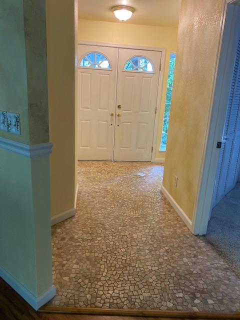 Upon entrance through the double front  doors {with sidelights} you will be greeted by natural stone flooring. As you continue into the great room, you will be meet the luxury vinyl plank flooring, vaulted ceilings and multiple windows offering lots of natural light and views of the serene forest.