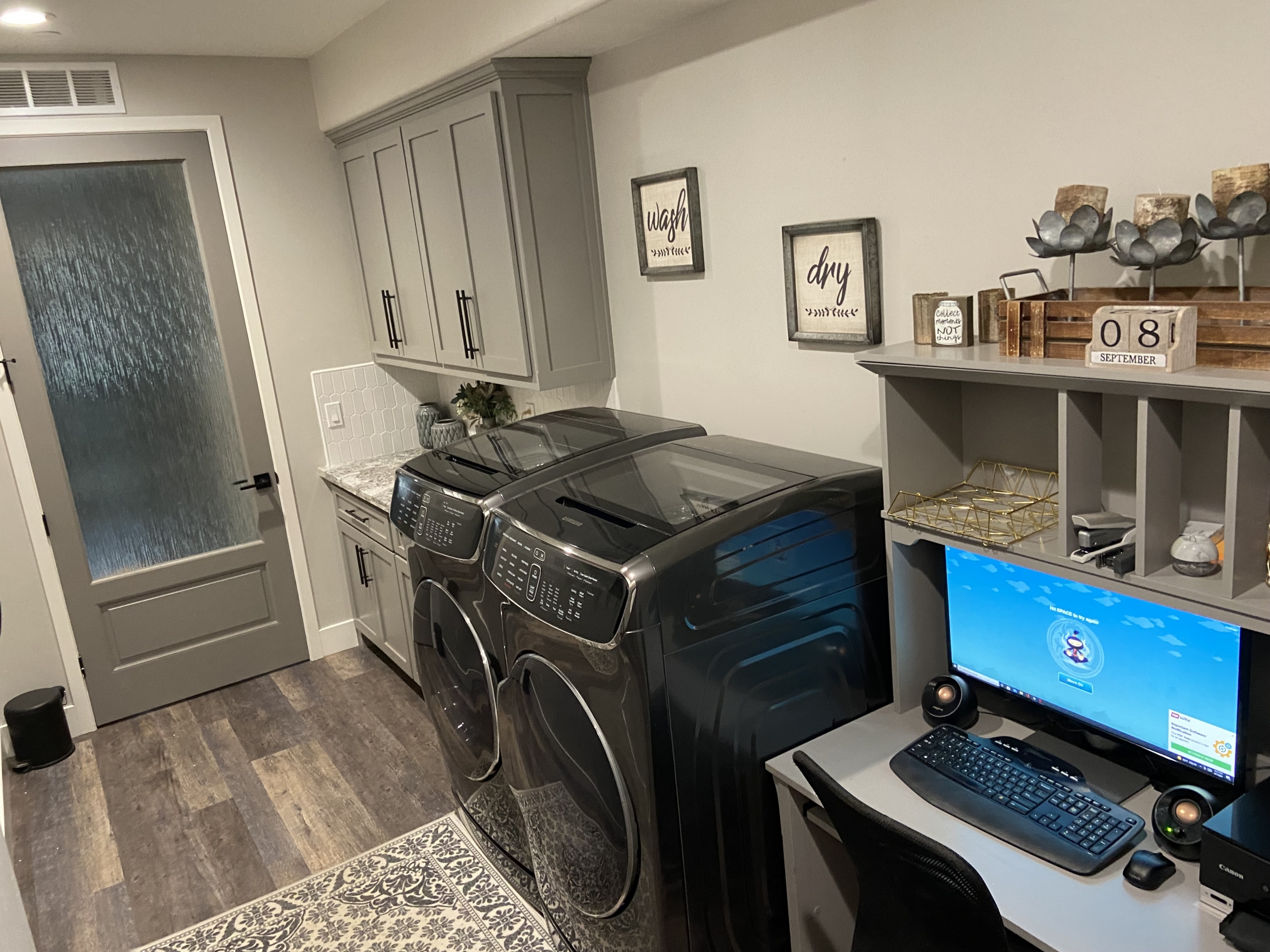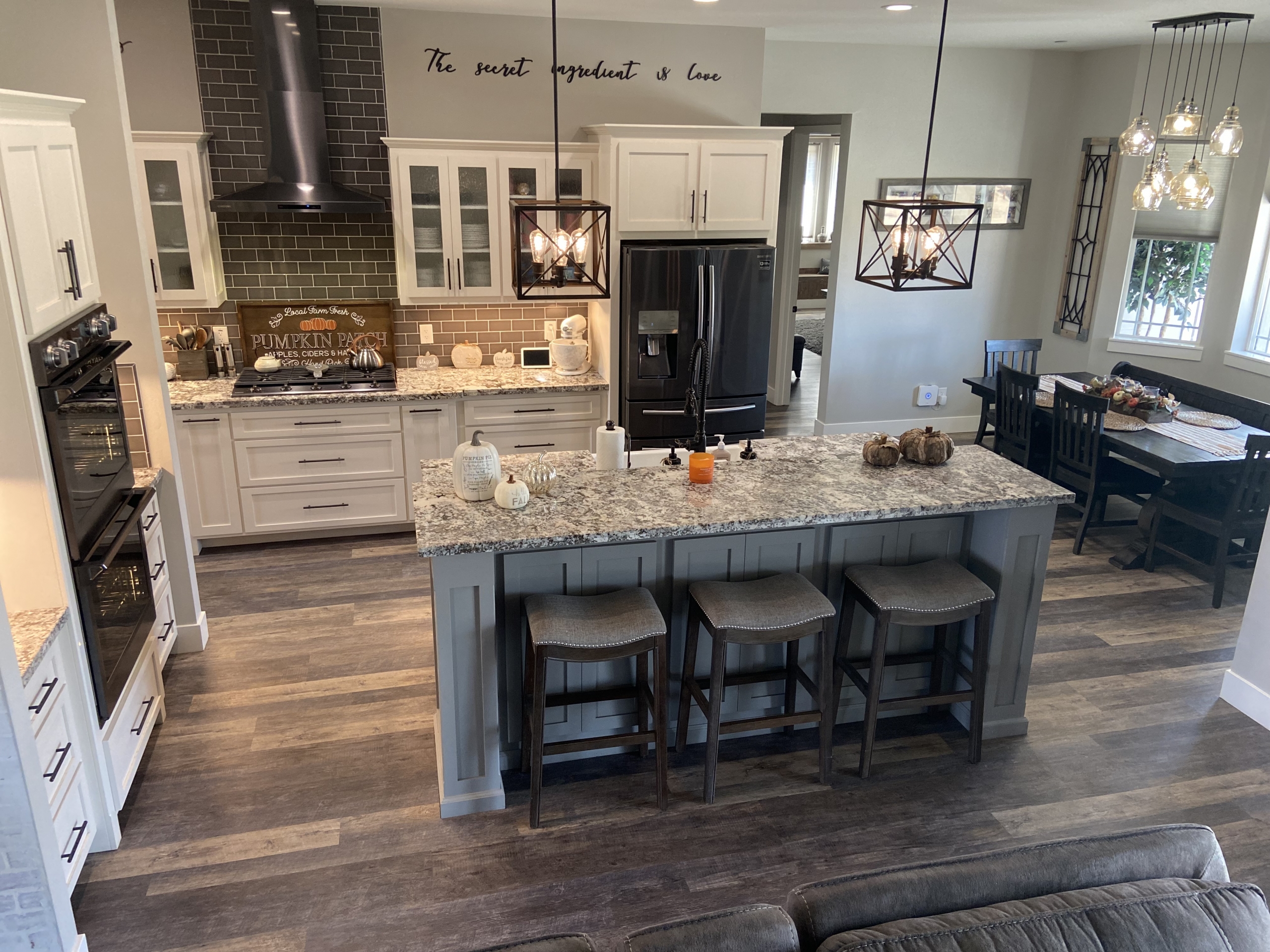 The Stunning open kitchen features all custom two-tone cabinets, large Kitchen Island with beautiful granite counter tops. The kitchen is equipped with top-of-the-line matching black stainless-steel appliances including Smart Double oven, Smart 36 five burner cooktop with smart hood, built in microwave, and dishwasher. The kitchen has endless cabinet and drawer space and also features a walk-in pantry.
