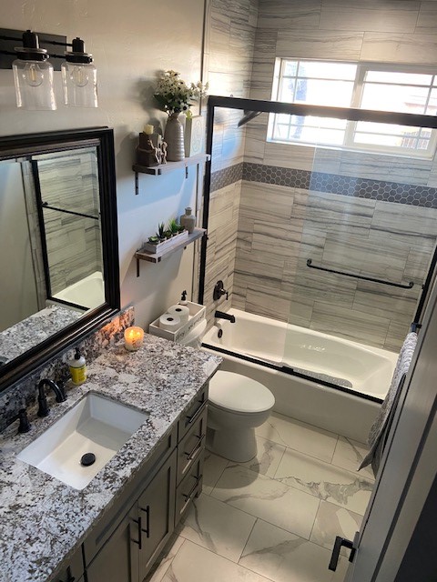 This home is anything but cookie cutter with Multi elevation high ceilings, trimmed and under lit coffered accents. In addition, this house comes with nonstandard 8 tall doors throughout and an 8×12 four panel, glass sliding doors that separates the living room from the patio that allows tons of natural light in, as well as opens up to merge the living room and patio into one massive entertaining space. The living room is outfitted with a 27,000 BTU high efficiency remote controlled gas fireplace surrounded by stone floor to ceiling.