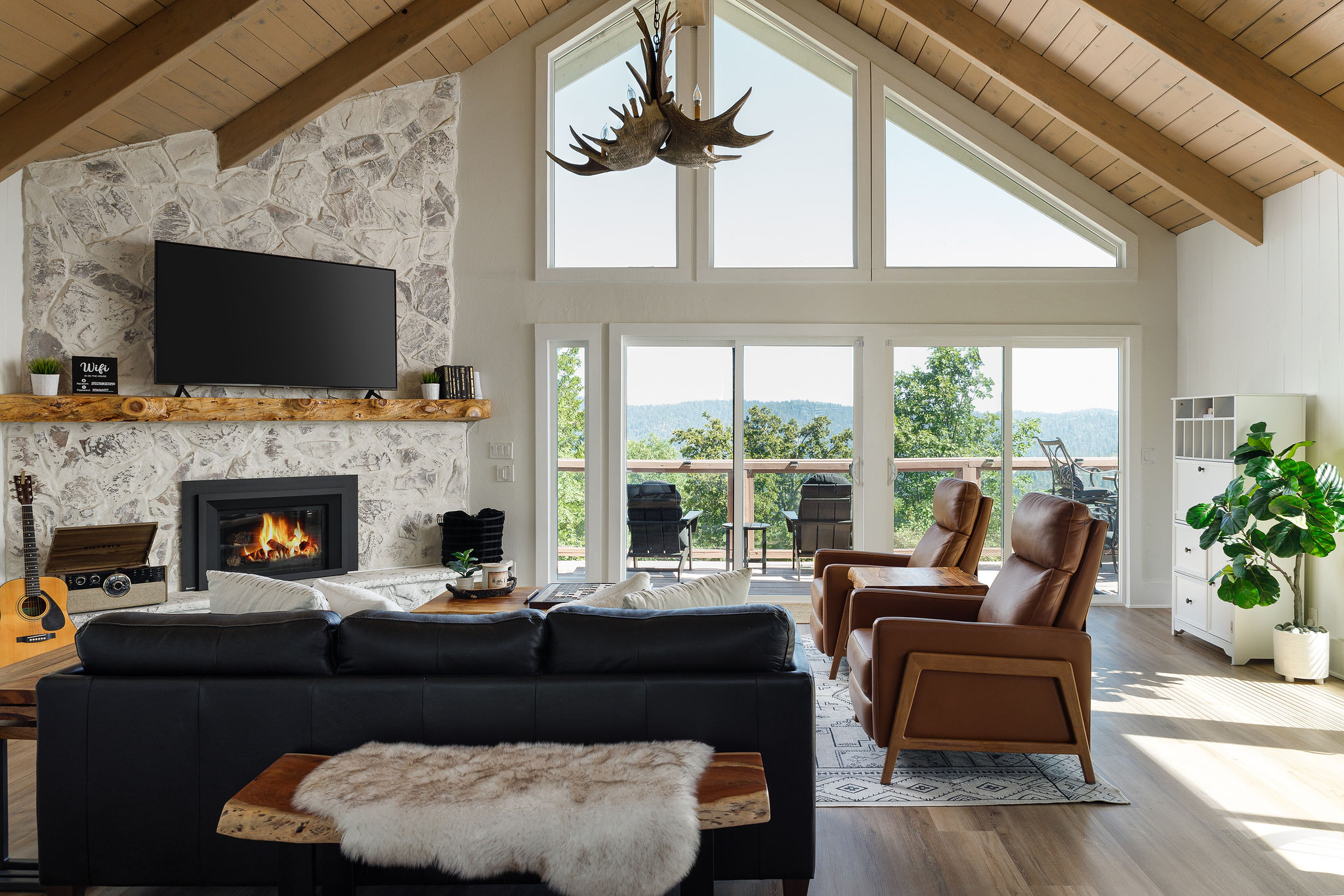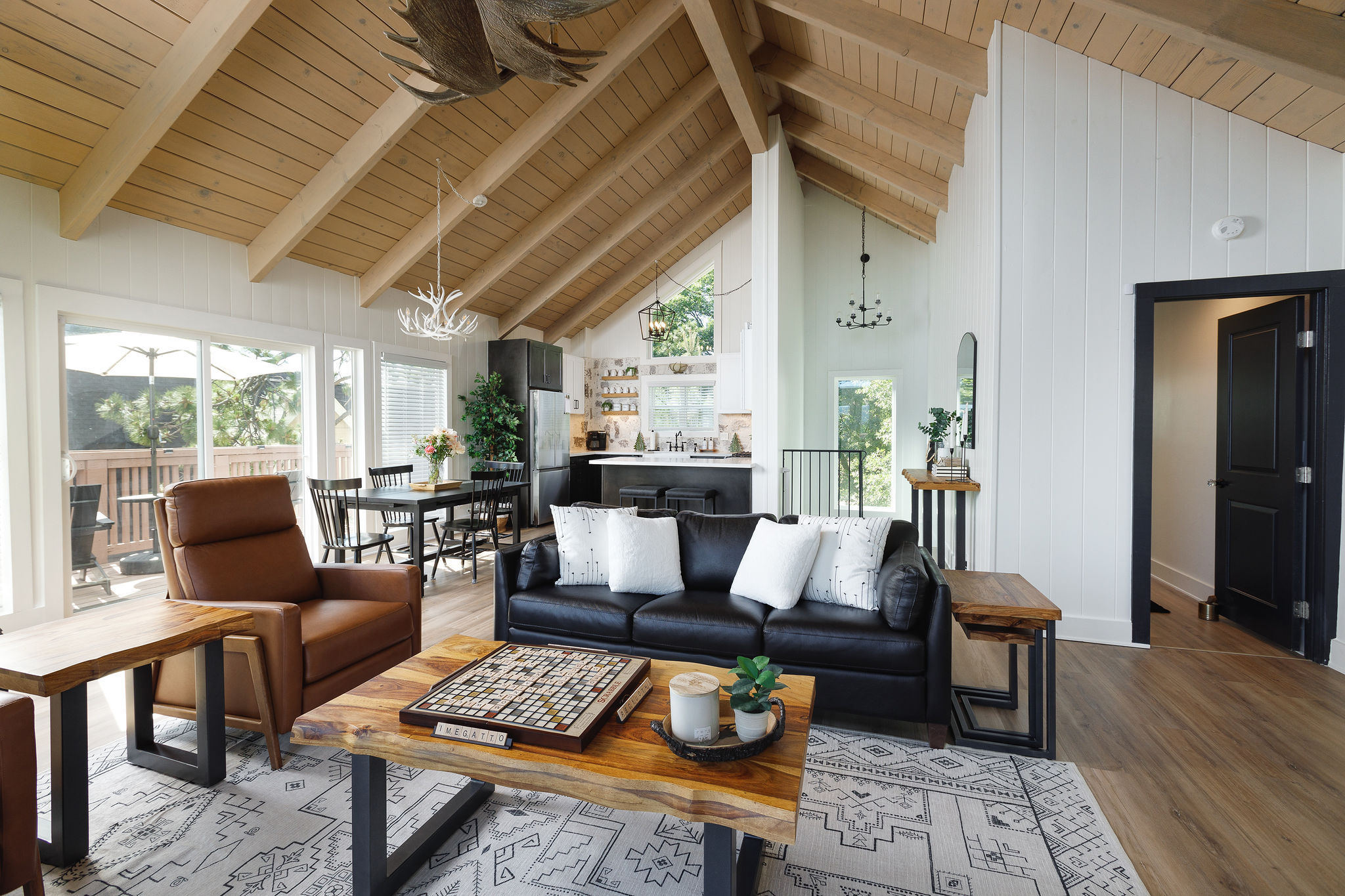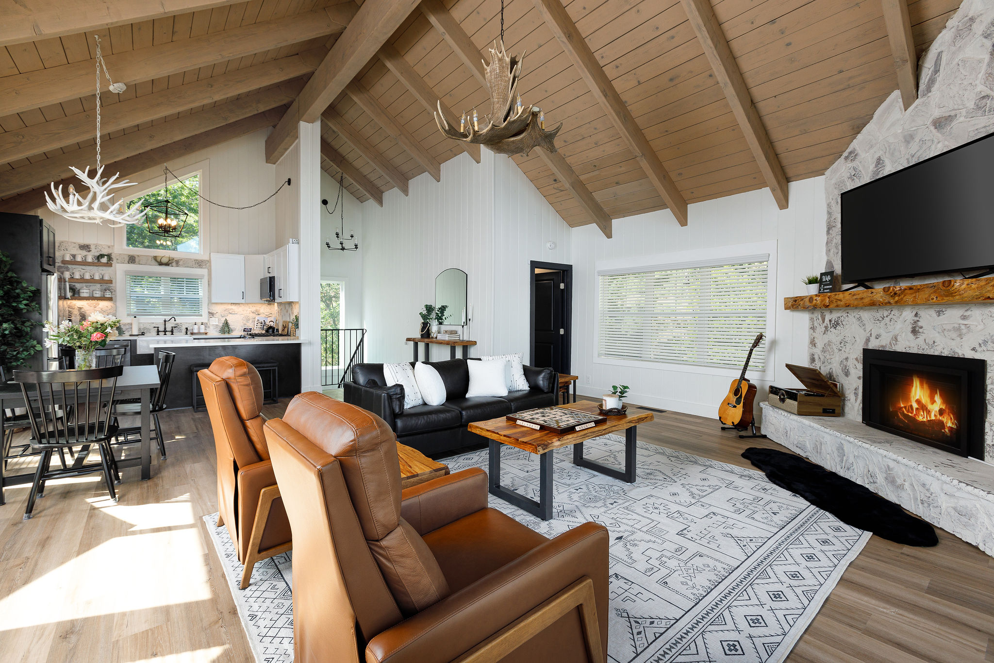 The hearth of the home is the spacious 2nd floor common area featuring an open concept living and dining/kitchen space adorned with a beautiful stone gas fireplace and a generously-sized wrap-around deck that invites you to soak in the serene surroundings. With comfortable bedrooms, and spa-like bathrooms, every inch of this cabin has been designed with comfort and relaxation in mind.
