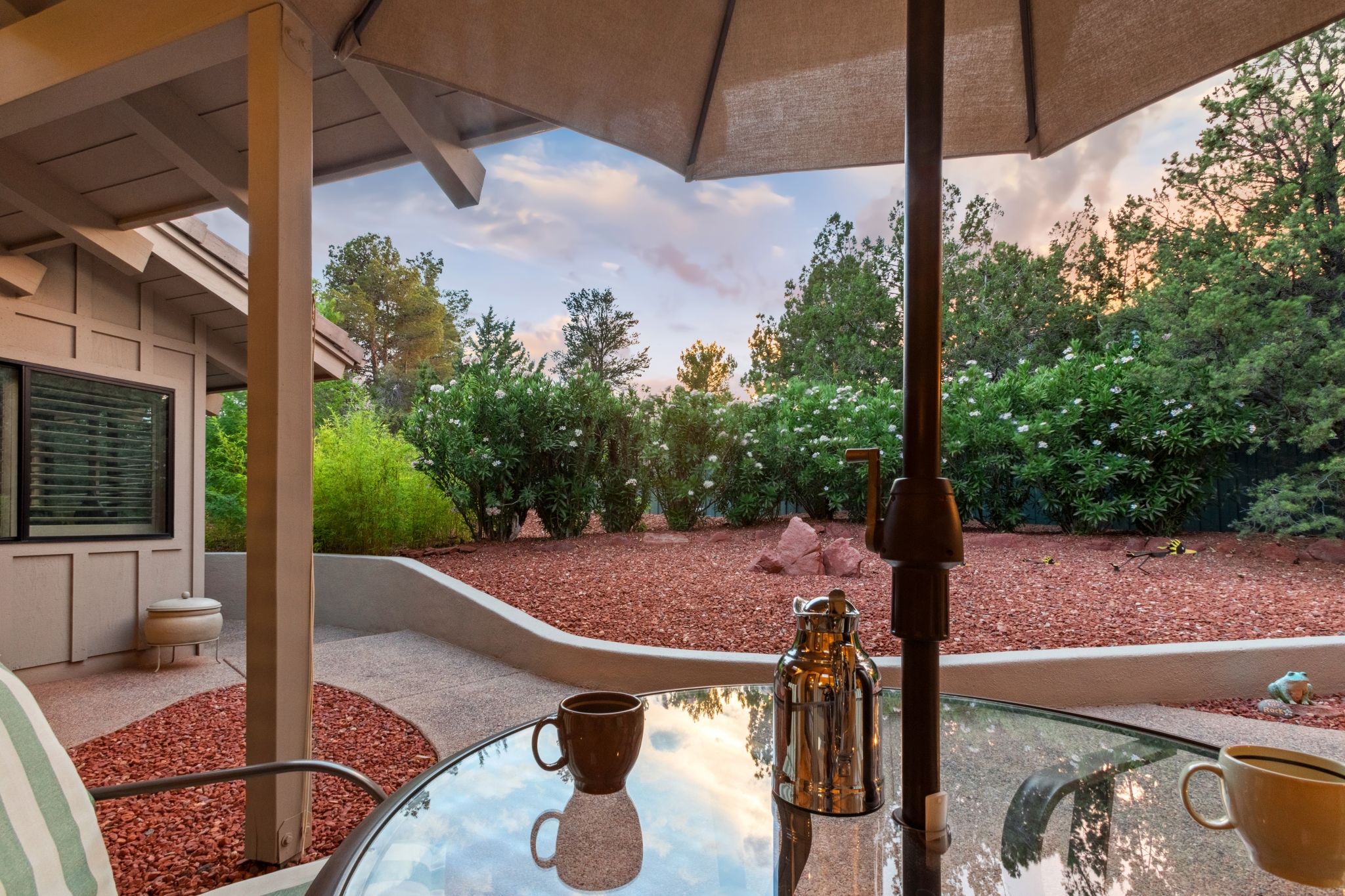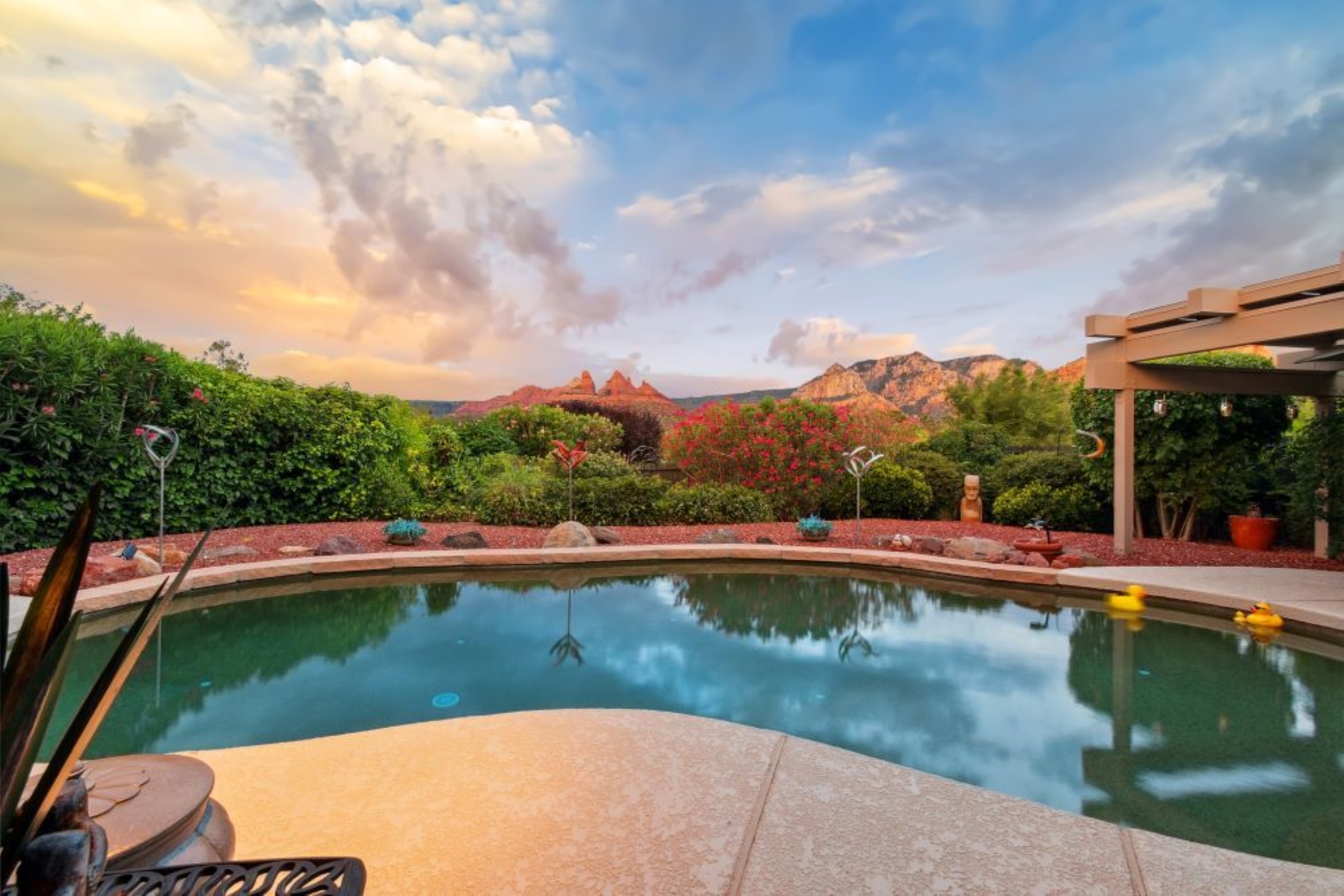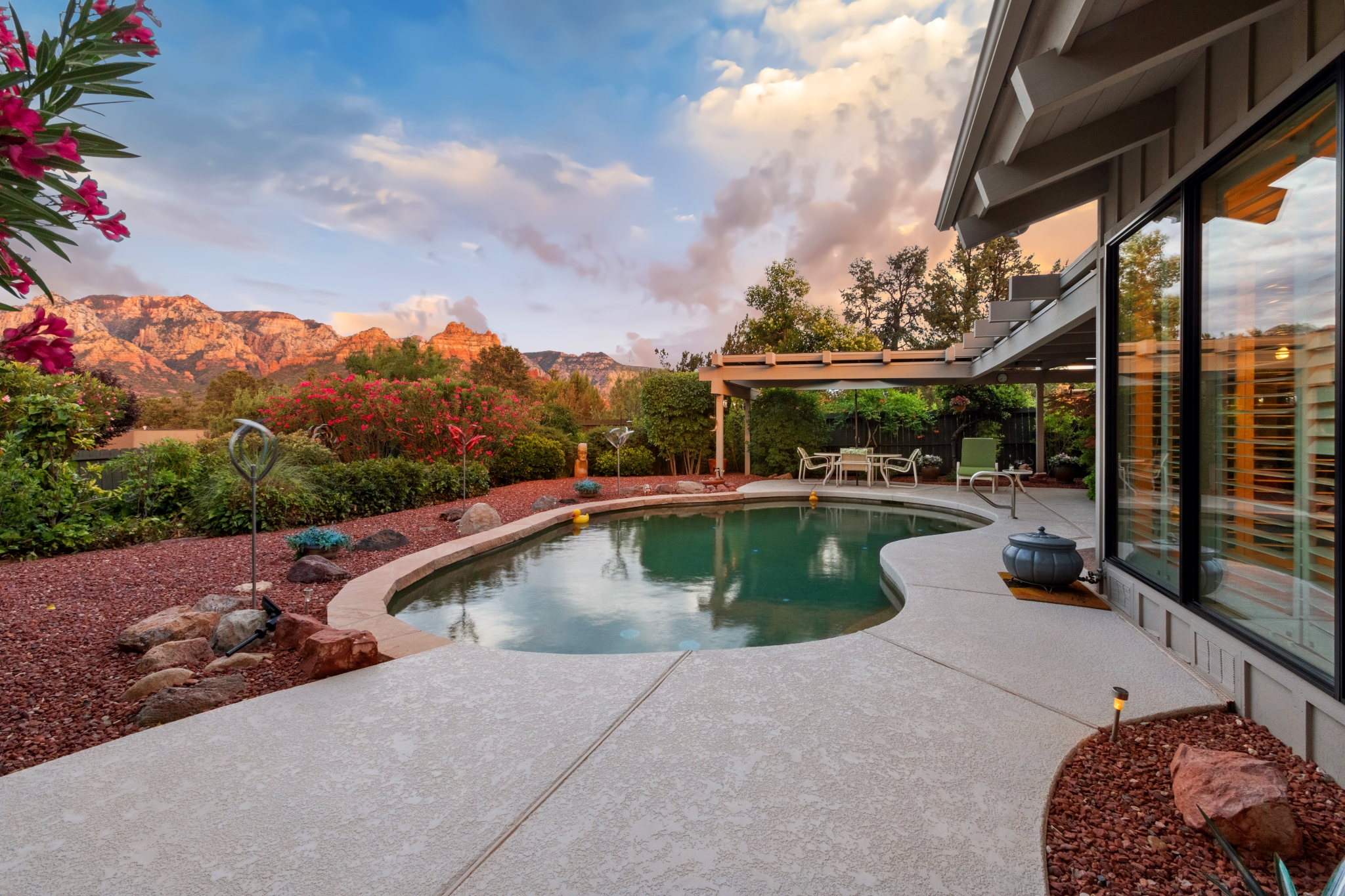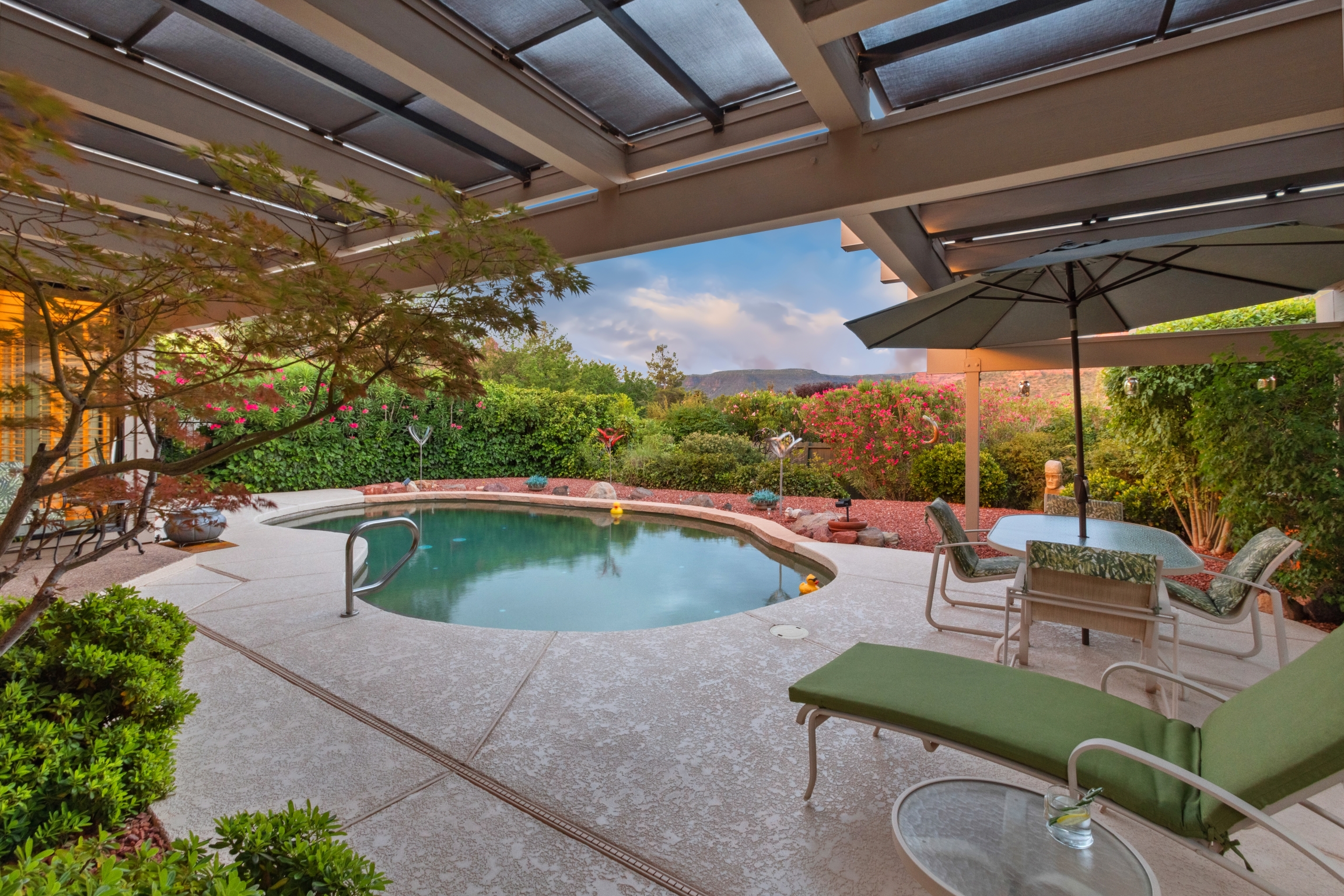 Hidden Utopia in Uptown! Highly desirable location, short walking distance to Shops, Restaurants and Hiking trails. Contemporary single level home with lush landscaping, private setting and totally fenced in. Immaculate home, floor plan splits into 2 bedrooms and 2 bathrooms which flanks the living area with a streamlined kitchen and dining room. Open concept design with vaulted ceilings and skylights, bright, airy and serene. Plantation shutters throughout to enjoy nature’s beauty surrounding the home. The great room has exceptional eastern views towards the Red Rocks and a private pool nestled among the Oasis. Beautiful sunset views from the living room, screened in Arizona room or while taking a dip in the swimming pool. Finished oversized 2 car garage with workbench, cabinets and storage. No HOAs and new roof. Relax and immerse yourself in this calming paradise.