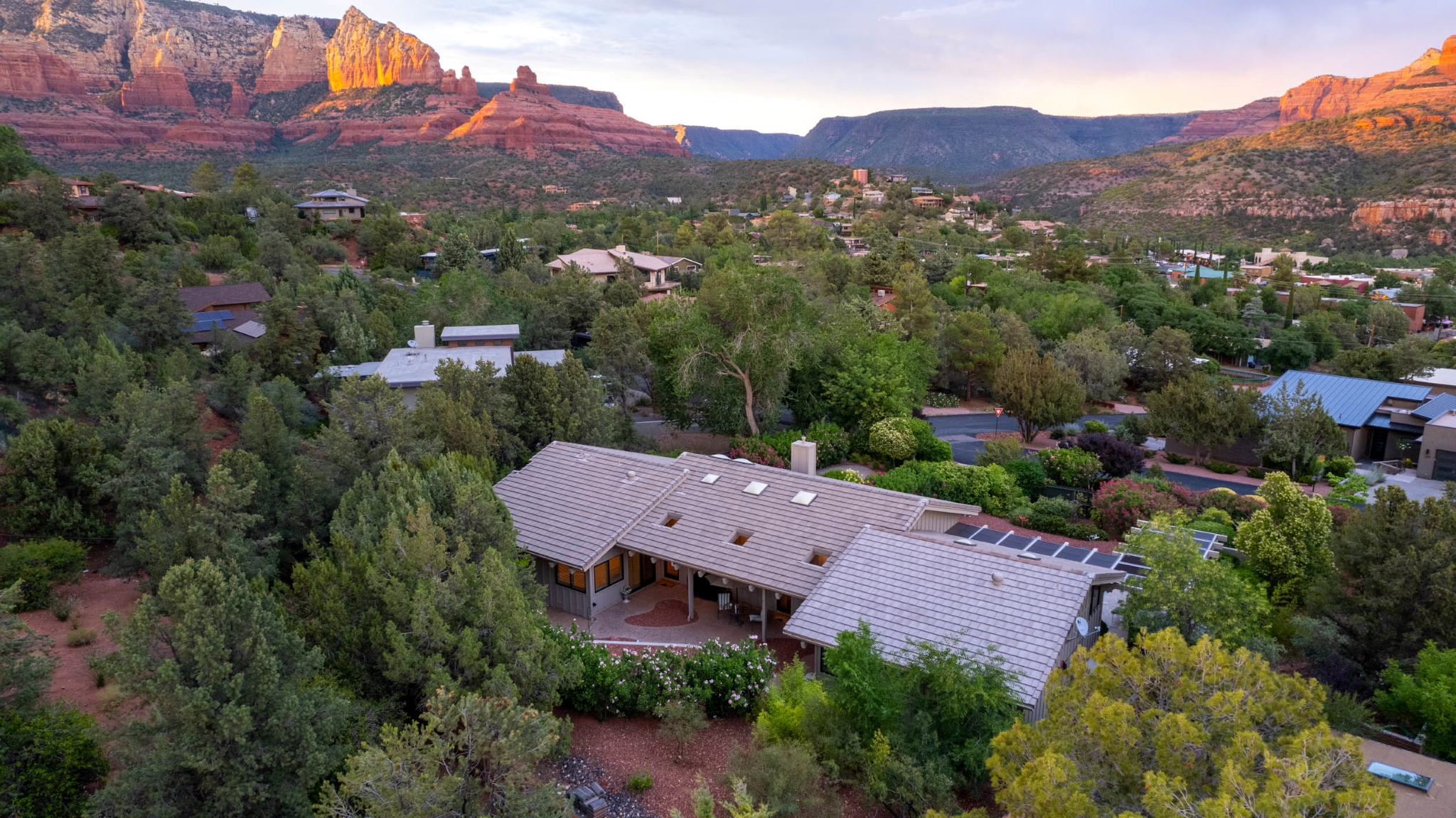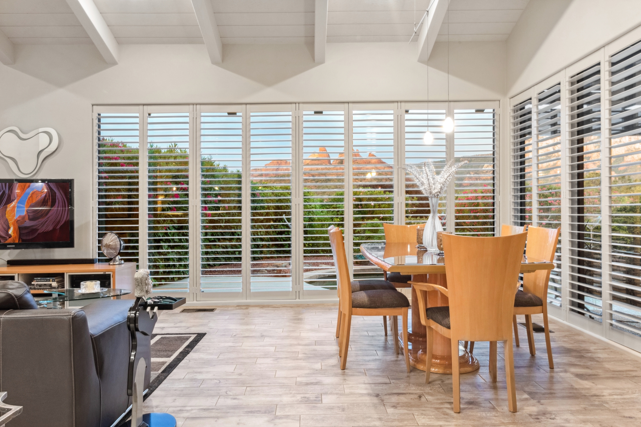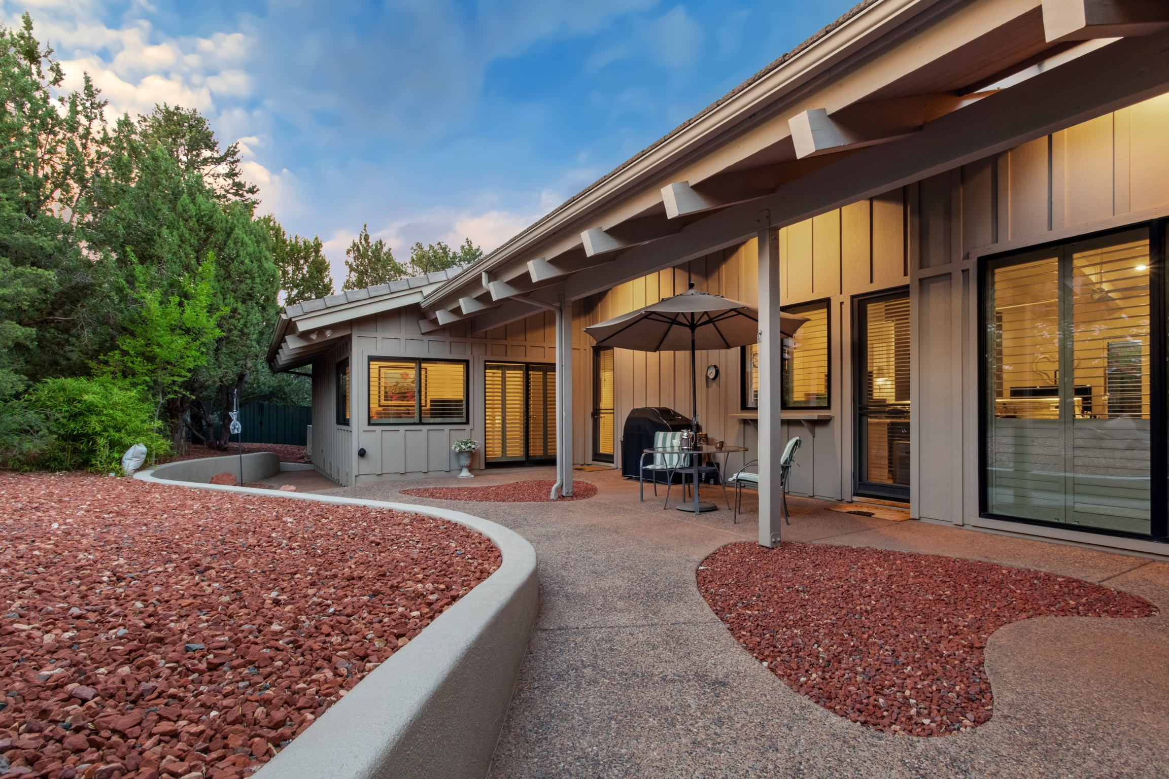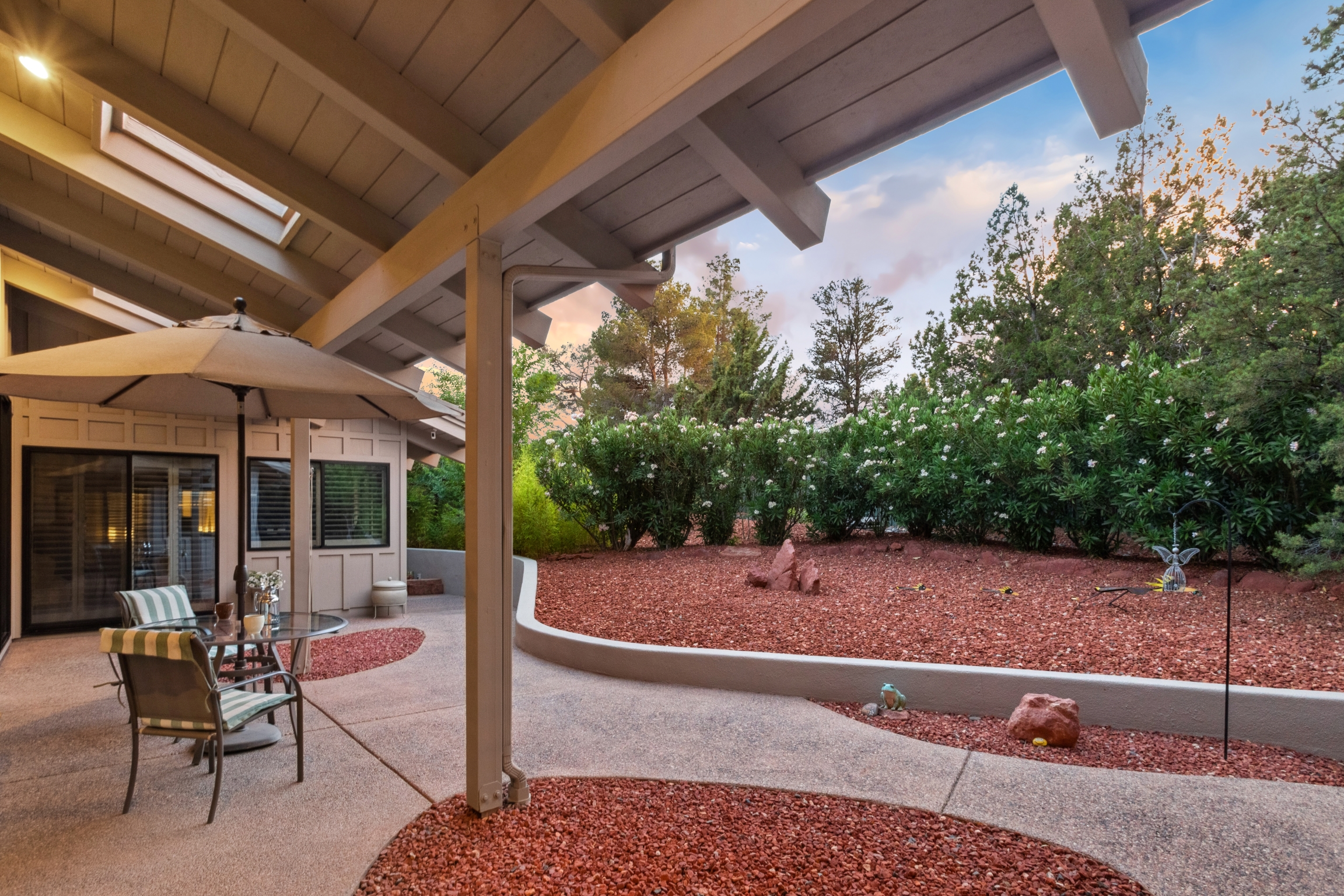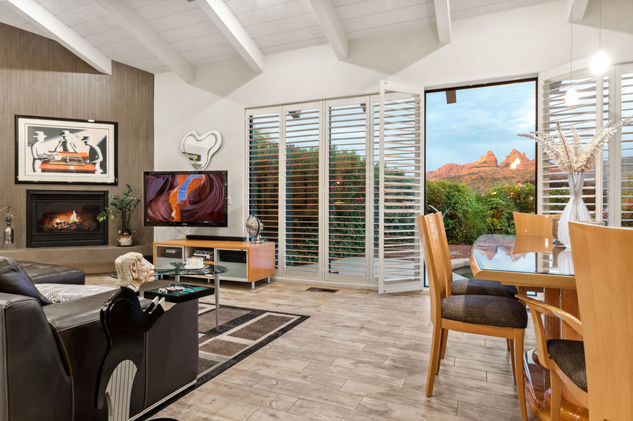 Hidden Utopia in Uptown! Highly desirable location, short walking distance to Shops, Restaurants and Hiking trails. Contemporary single level home with lush landscaping, private setting and totally fenced in. Immaculate home, floor plan splits into 2 bedrooms and 2 bathrooms which flanks the living area with a streamlined kitchen and dining room. Open concept design with vaulted ceilings and skylights, bright, airy and serene. Plantation shutters throughout to enjoy nature’s beauty surrounding the home. The great room has exceptional eastern views towards the Red Rocks and a private pool nestled among the Oasis. Beautiful sunset views from the living room, screened in Arizona room or while taking a dip in the swimming pool. Finished oversized 2 car garage with workbench, cabinets and storage. No HOAs and new roof. Relax and immerse yourself in this calming paradise.