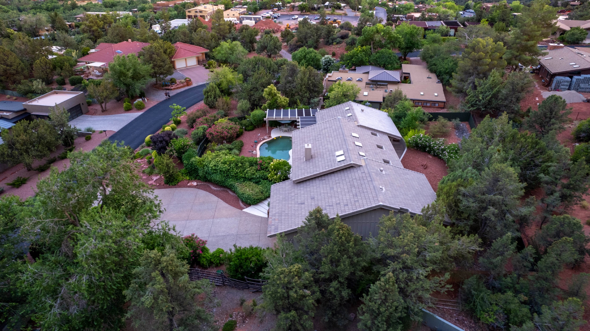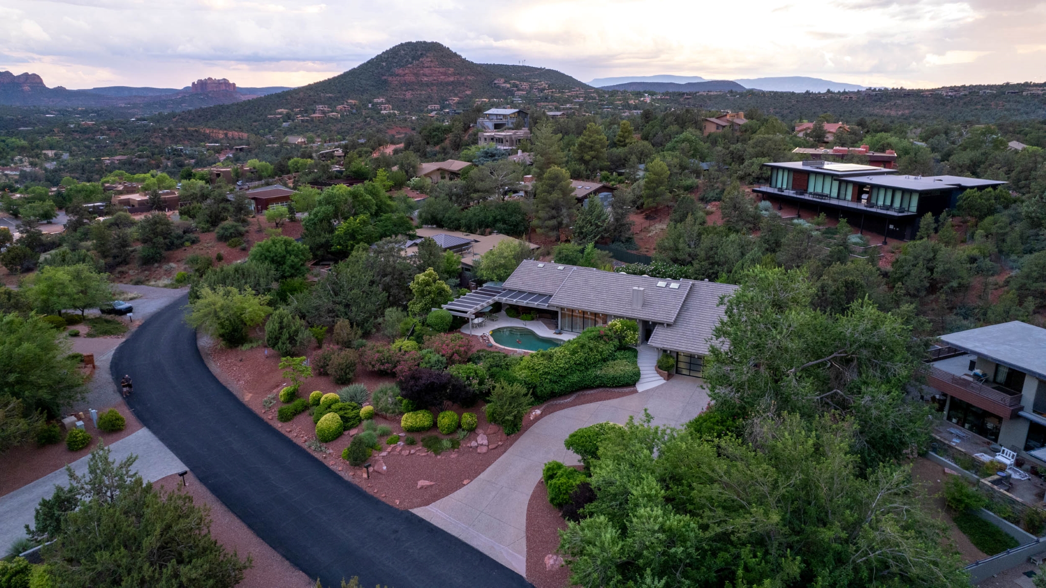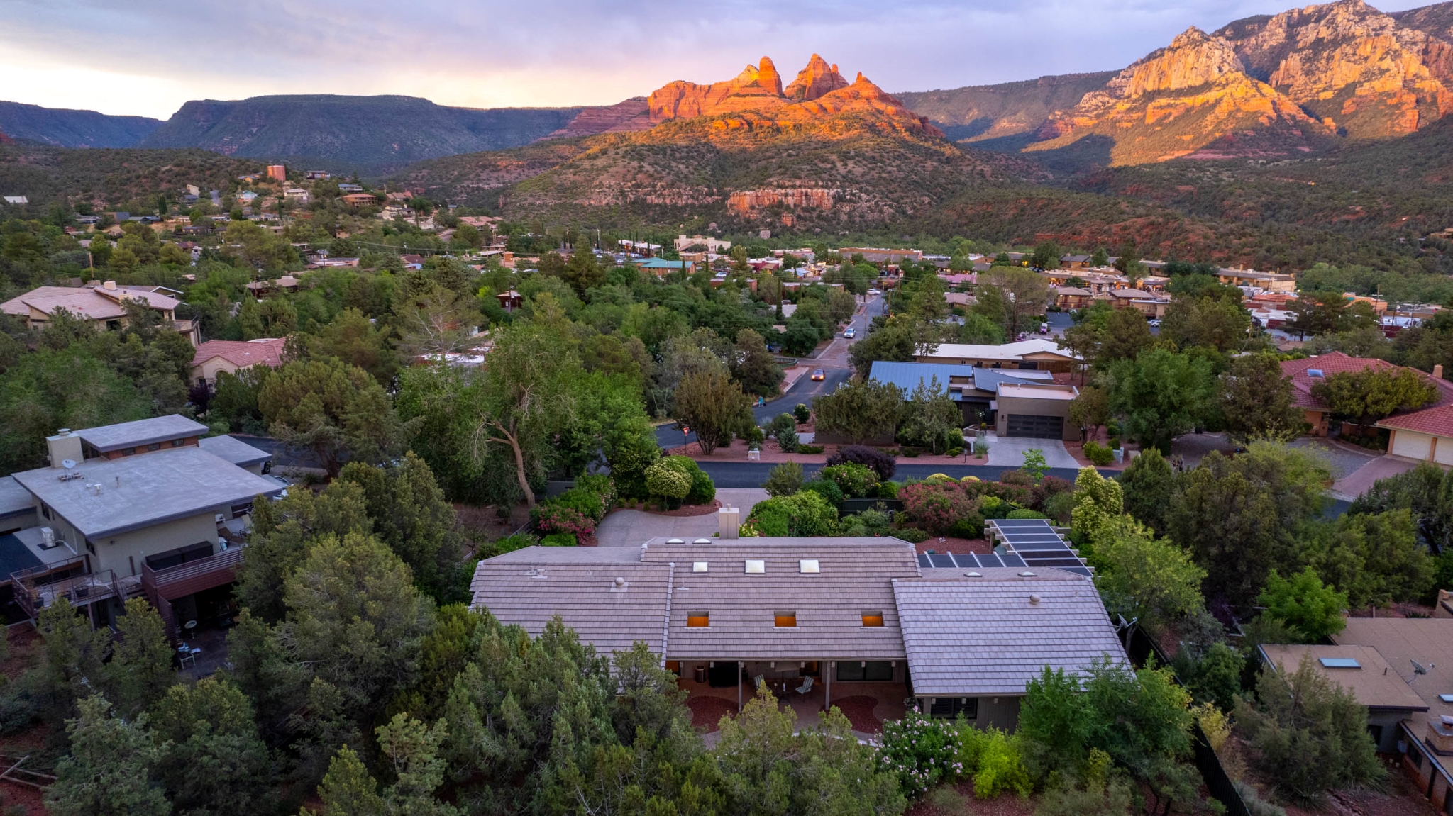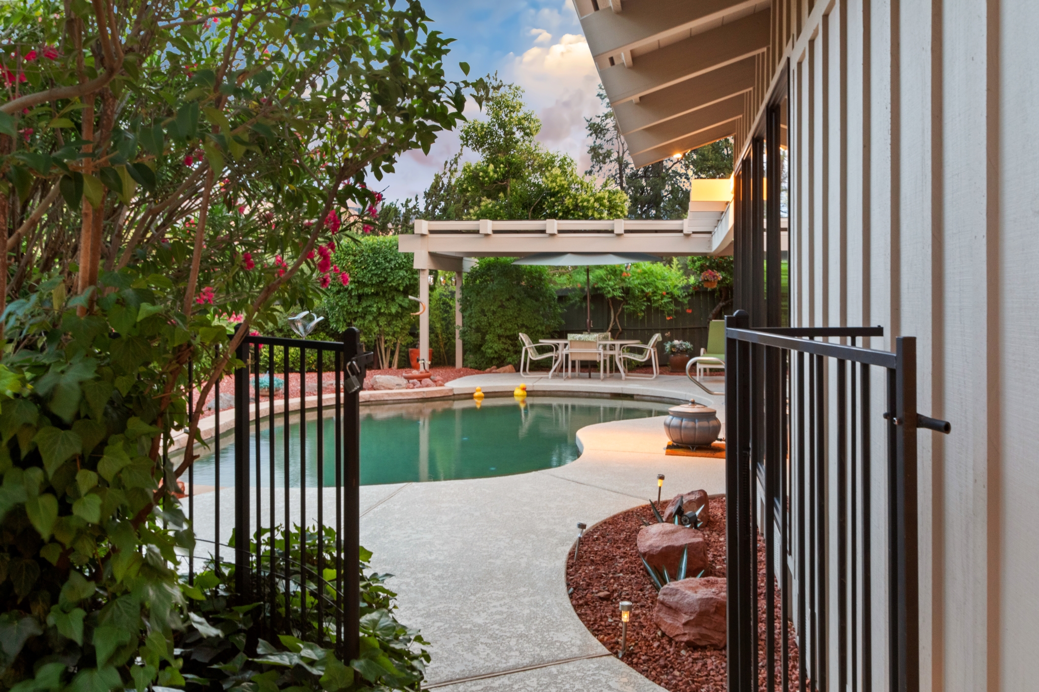 Hidden Utopia in Uptown! Highly desirable location, short walking distance to Shops, Restaurants and Hiking trails. Contemporary single level home with lush landscaping, private setting and totally fenced in. Immaculate home, floor plan splits into 2 bedrooms and 2 bathrooms which flanks the living area with a streamlined kitchen and dining room. Open concept design with vaulted ceilings and skylights, bright, airy and serene. Plantation shutters throughout to enjoy nature’s beauty surrounding the home. The great room has exceptional eastern views towards the Red Rocks and a private pool nestled among the Oasis. Beautiful sunset views from the living room, screened in Arizona room or while taking a dip in the swimming pool. Finished oversized 2 car garage with workbench, cabinets and storage. No HOAs and new roof. Relax and immerse yourself in this calming paradise.