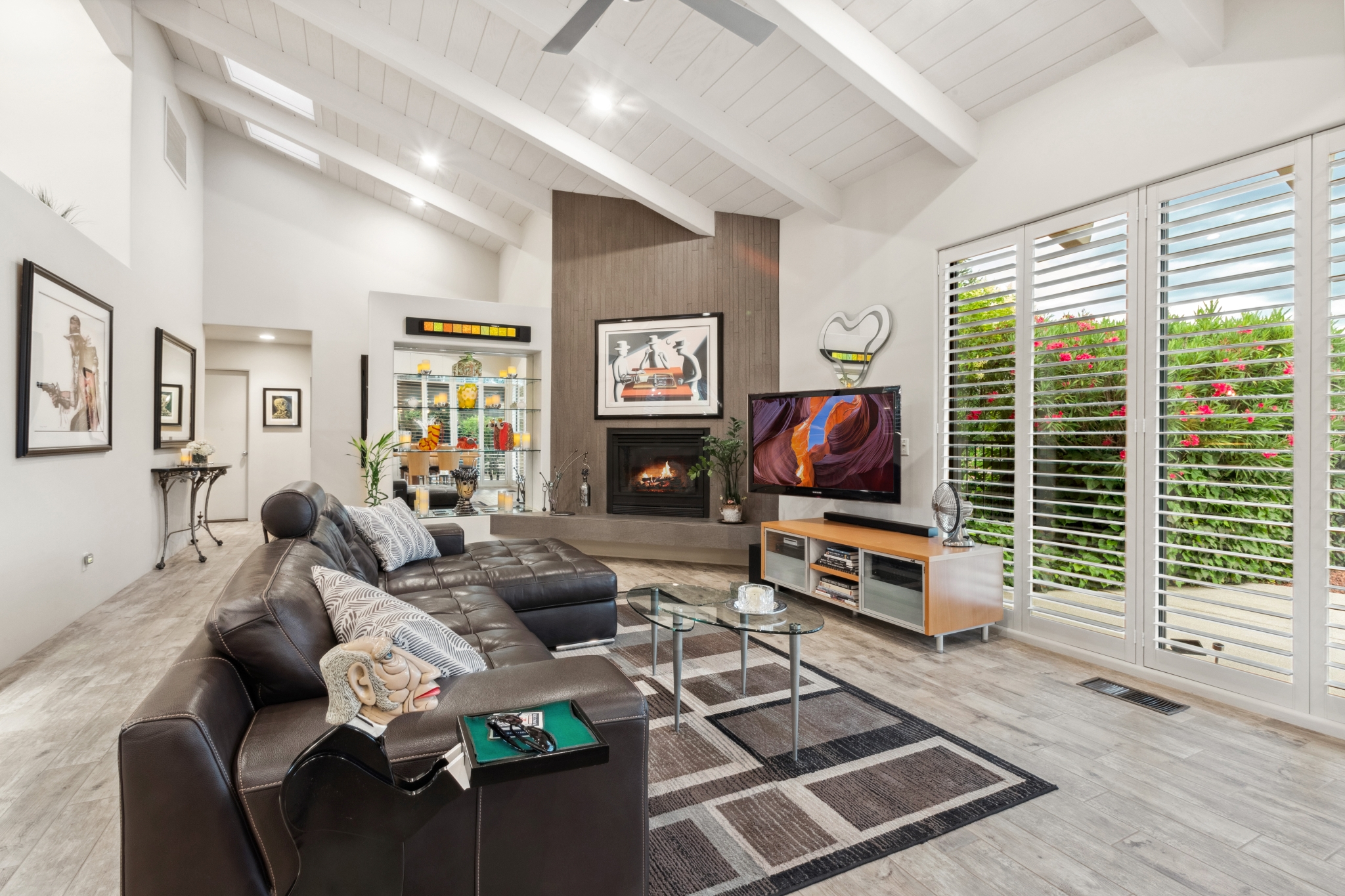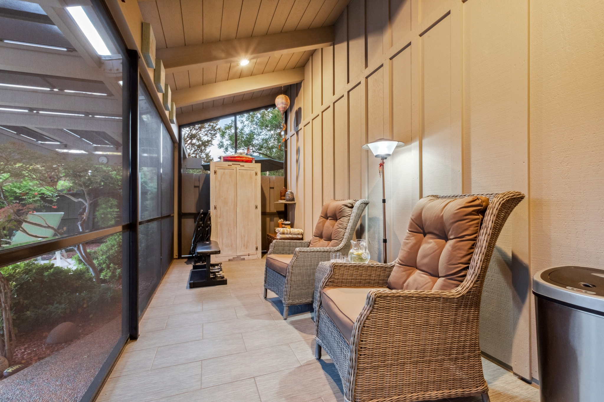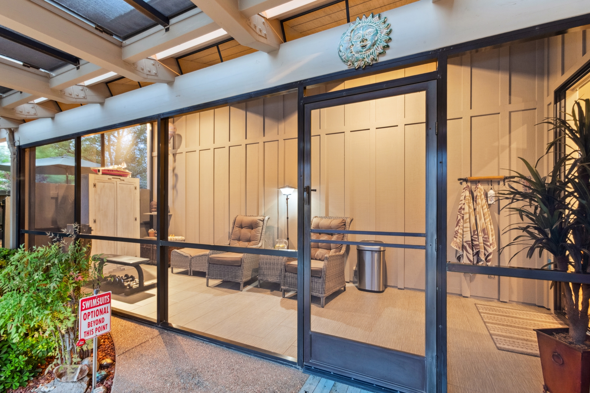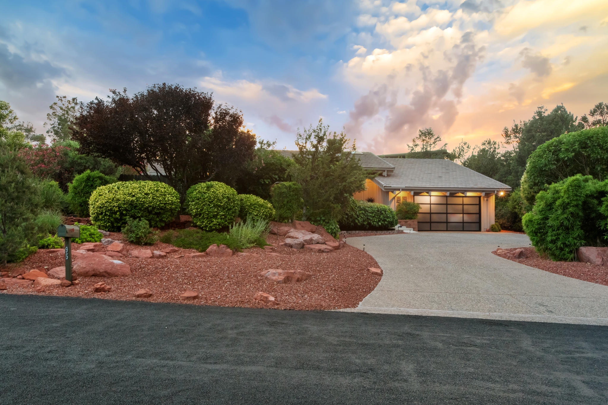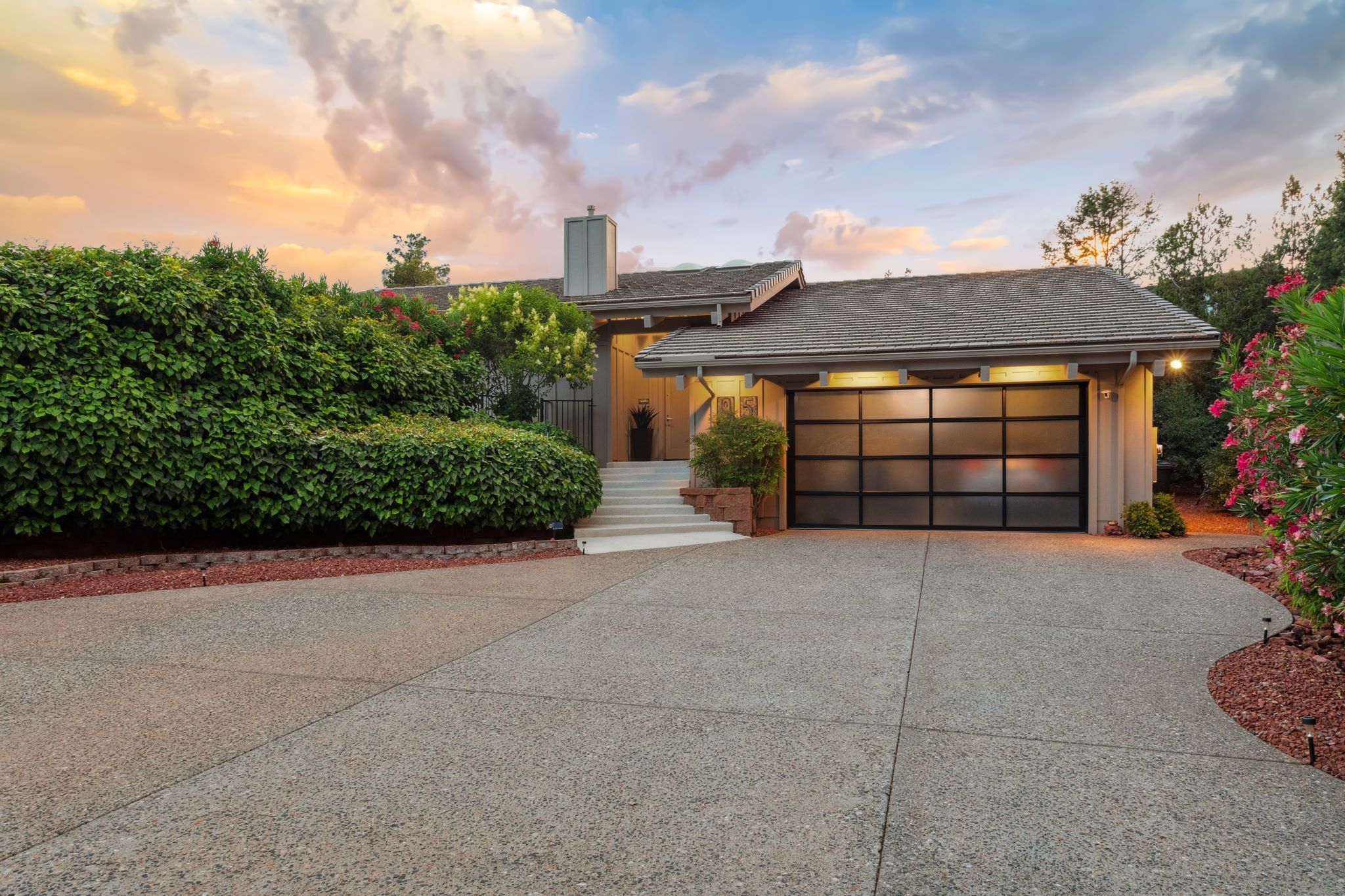 Hidden Utopia in Uptown! Highly desirable location, short walking distance to Shops, Restaurants and Hiking trails. Contemporary single level home with lush landscaping, private setting and totally fenced in. Immaculate home, floor plan splits into 2 bedrooms and 2 bathrooms which flanks the living area with a streamlined kitchen and dining room. Open concept design with vaulted ceilings and skylights, bright, airy and serene. Plantation shutters throughout to enjoy nature’s beauty surrounding the home. The great room has exceptional eastern views towards the Red Rocks and a private pool nestled among the Oasis. Beautiful sunset views from the living room, screened in Arizona room or while taking a dip in the swimming pool. Finished oversized 2 car garage with workbench, cabinets and storage. No HOAs and new roof. Relax and immerse yourself in this calming paradise.